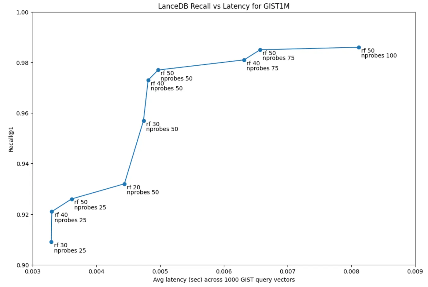 When using an IVF-PQ index, there’s a trade-off between recall and latency at query time. You can improve recall by increasing the number of probes and the refine_factor. In our benchmark on the GIST-1M dataset, we show that it’s possible to achieve >0.95 recall with a latency of under 10 ms on most systems, using ~50 probes and a refine_factor of 50. This is, of course, subject to the dataset at hand and a quick sensitivity study can be performed on your own data. You can find more details on the benchmark in our